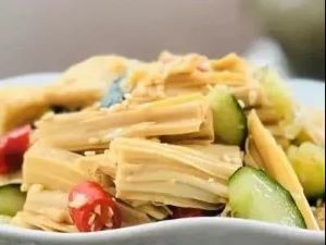 2、将泡好的腐竹切成自己需要的长短,焯水,水开放入,再沸时捞起放入白开水里,过凉备用