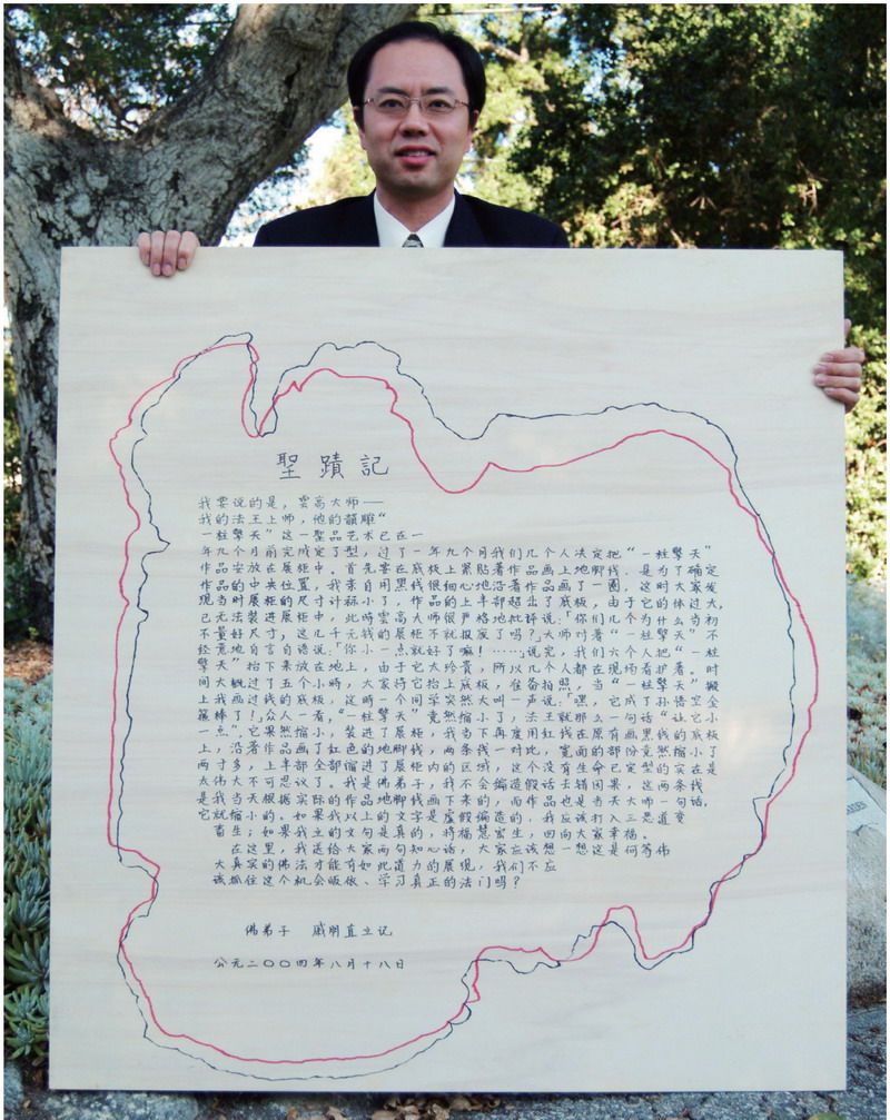 这个作品硬如顽石,而且距作品完成到现在的期间,它不曾有过任何的变化,怎么就在大法王师父责备它太大,应该小一点,五个小时就应声变化了?还不光只是缩小,窄的部分还长了出来,一切的变化,刚好都配合了灯箱的大小。这五个小时,我们都没有离开过放灯箱和作品的现场,大家都在现场看大法王师父给作品上色。由于这里有很多鸟,也怕鸟飞在上面,污染作品,所以我们都没有离开过。