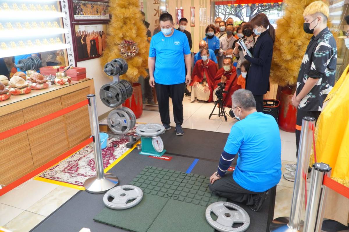 图说:世界佛教正心会举办金刚钩拿杵上座测试,上次成功用金刚杠提起二百磅的参加者,此次又来参加用金刚钩提拿一百八十八磅提拿失败。〈照片世界佛教正心会提供〉