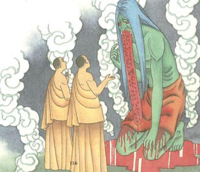 有一个名叫晡刺拏的外道师,由于他生前造口业,宣传邪教,业报所感,其身甚大,于其舌上有五百铁梨耕垦,血流满身。晡刺拏看见二尊者时说:「仁者!我拜託您!您若回到南赡部洲时,传我的话,对我门徒说:我生前口说邪法,欺诳他们,因此恶业,死后堕于无间地狱中;我舌上有五百铁犁,耕垦流血,受极苦恼。你等供养我木塔时,我身苦痛,倍更增剧。从此以后,勿再供养。」。