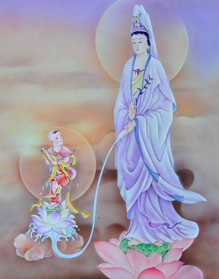 尔时善财童子,于观自在菩萨所,得甚深智,入大悲门。以甚深心,随顺观察,心无疲厌。一心顶礼观自在菩萨足,绕无数匝,敬承其教,辞退而行。