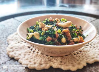 3、蒸熟的山药块倒入,小火翻炒一分钟。