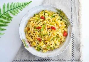 材料:绿豆芽200克,山芋粉丝100克,盐2克,蔬果粉少许,生抽一匙,红绿辣椒丝适量,醋半匙