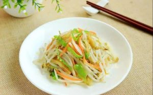材料:绿豆芽300克,胡萝卜1根,青椒1个,榨菜30克,植物油、盐各适量