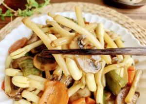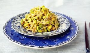 3. 热锅热油,炒香姜末,下豆芽、素蚝油和盐,快速炒匀盛出即可。