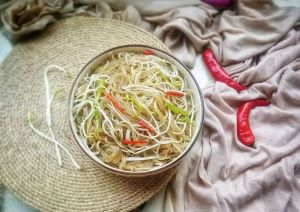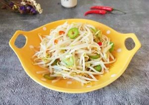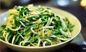 3. 锅中放油,倒入翻炒,放醋、盐、鲜蔬粉炒至豆芽断生即可。