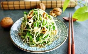 材料:黑豆芽300克,鲜核桃6个,黑醋少许,盐适量