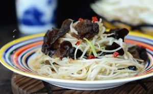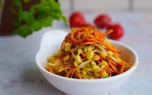 材料:豆芽30克,盐5克,胡萝卜1个,黑木耳5克,苦麦100克,香油、面粉各适量
