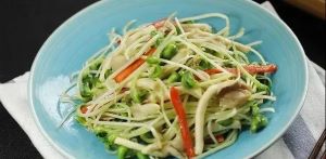 材料:花生芽400克,鲜蘑菇5个,胡萝卜1/3根,青椒1/4个,素蚝油1勺,盐适量