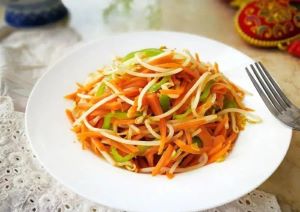 材料:胡萝卜,豆芽,青菜,姜末,植物油,盐,醋,生抽,辣椒粉,麻油