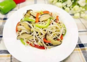 1. 热锅凉油,放入姬菇进去翻炒到微微发软后,加入黑豆芽进去翻炒。