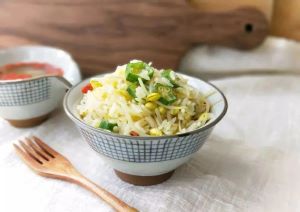 材料:豆芽一小碗,秋葵一根,米饭一碗,枸杞少许,植物油、盐、蔬果粉各适量