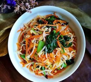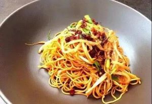材料:面条,豆芽,胡萝卜,盐,干辣椒,酱油