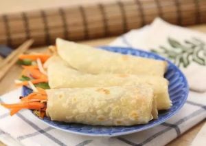 5. 之后将炒好的蔬菜包裹在面饼里。