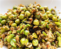 3. 热锅热油倒入豌豆翻炒半分钟;