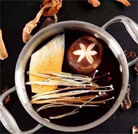 2、陶锅内倒入清水4碗、放入药膳高汤粉1包加热。