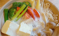 豆浆锅低脂又营养,最近成为瘦身族欢迎的锅品。煮豆浆锅时,重点是要先直接用蔬菜煮锅料,等到差不多了再倒入豆浆(原味),最后再依自己的喜好做适当的调味即可,原味或加点辣都很好吃。此外,因为豆浆很容易烧焦,所以记得要常搅动锅底。
