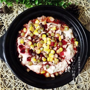 内酯豆腐一盒半、香菇三朵、甜菜根一块、玉米粒适量、青豌豆、香油、盐适量
