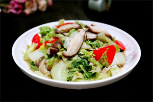 1. 大白菜、香菇、红椒洗净2. 香菇、红椒切片3. 大白菜切段4. 锅中放油烧热,下入红椒和香菇翻炒5. 放入大白菜翻炒6. 加盐、少许蔬果粉调味出锅