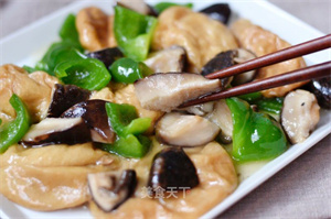 鲜香菇4个、青椒1个、湿面筋12个、油适量、盐少许、蔬果粉少许、水淀粉少许