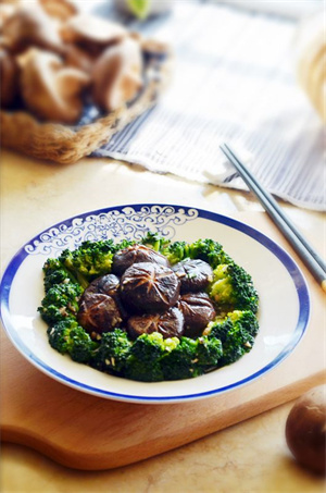 1. 把香菇清洗干净,切去根蒂;把香菇,刻出花刀2. 香菇蒂切成碎末,西蓝花切成小块3. 香菇和西兰花焯水备用4. 热锅,放入食用油,放入香菇碎和姜末;翻炒5. 加酱油、水淀粉、少许食盐,搅拌6. 把沥干水的香菇和西蓝花,一起放入翻炒均匀,收汁即可