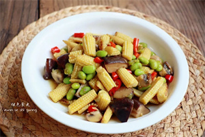鲜香菇6朵、毛豆籽适量、玉米笋6根、食盐适量