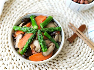 1. 芦笋切段,胡萝卜切片,香菇切片2. 香菇下油锅煸炒3. 再下芦笋和胡萝卜4. 加素蠔油,盐,和蔬果粉翻炒均匀即可