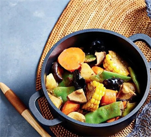 锅中注入油,五成热,放入姜片、八角煸香3、放入土豆块煎至边缘微焦,加胡萝卜、油豆角翻炒至豆角变色。 4、锅中加入香菇、木耳、甜玉米,加入酱油和水,水量没过所有食材为宜5、翻炒均匀后大火烧开,调成小火焖煮10分钟,调入盐后大火收浓汤汁即可。