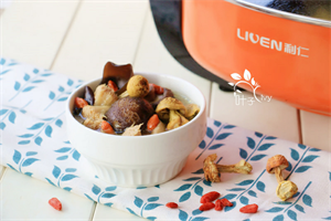 姬松茸10克、茶树菇10克、猴头菇25克、香菇10克、枸杞子5克、木耳5克、盐适量