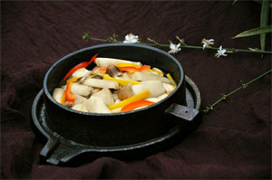 姬松茸(新鲜)310克、豆腐250克,姜末、素高汤、植物油、彩椒适量