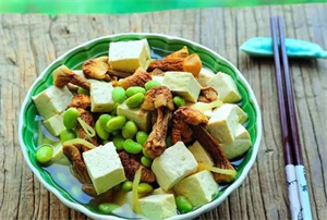 干姬松茸50克、豆腐350克、青豆120克、姜6克、淀粉适量、盐适量、香油少许