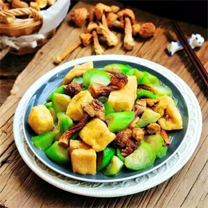 干姬松茸50克、丝瓜300克、豆腐泡100克、酱油、盐适量