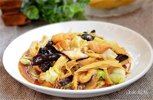 材 料:卷心菜100克,香菇3朵,黑木耳10朵,油面筋10只,腐竹,水淀粉、金兰素蠔油、盐、昆布粉适量