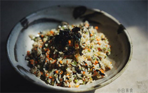 6、把煮好的白米糯米饭打散,放进去一起炒,加盐炒匀,最后加入之前煎好的紫菜酥快速拌炒均匀~开吃。
