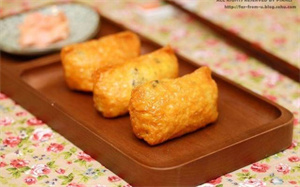 3、将豆腐泡皮打开,将米饭塞入豆腐泡皮中,叠好开口,摆盘即可。