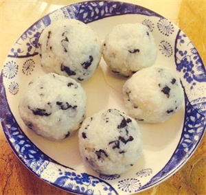 3、取一半的米饭,加入紫菜,芝麻和酱油拌好,用饭团模具扣出形状。