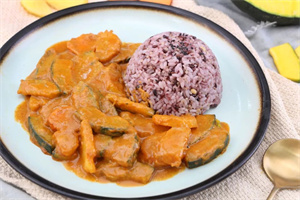-做 法-1. 将米淘洗干净,放入锅中煮熟;南瓜洗净,挖去内瓤,切成小块2. 将土豆和红薯洗净去皮,切成片3. 热锅起油,放入咖喱块,倒入椰汁炒匀4. 将红薯、土豆和南瓜全部放入锅里5. 稍微翻炒几下,盖上盖子焖一会儿,煮熟后翻炒几下收汁6. 最后将煮好的杂粮饭扣在盘中,倒上煮好的咖喱南瓜,完美!