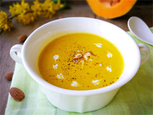 材料:南瓜250g,杏仁25g,橄榄油、椰汁适量