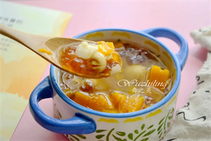 材料:南瓜适量、莲子100g、百合50g、桃胶15g