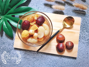 -做 法-1. 把板栗清洗后,切一个口子。放在开水里煮五分钟,取出剥壳;2. 马蹄去皮,可对半切开;红枣清洗干净后用清水浸泡十分钟;莲子清洗干净,泡发一小时后去芯去蒂头;板栗切小块;3. 浸泡后红枣去核;4. 将莲子先放入锅中,加1升清水煮开,煲煮十五分钟;5. 十五分钟后将马蹄放入锅中继续煲煮三十分钟;6. 煮30分钟后将板栗和红枣放入,继续煮20分钟;7. 出锅前10分钟放入冰糖,待冰糖融化,糖水就煲好啦。