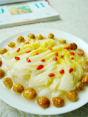 -做 法-1. 把娃娃菜洗净,切长条;2. 栗子洗净用刀切一小口用微波炉加热去壳;3. 枸杞用凉水泡泡洗净捞起,淀粉用凉水兑好;4. 把素高汤倒入锅中烧开,用少许蔬果粉和盐调味,再撒入少许胡椒粉搅匀;5. 把切好的娃娃菜条平推入锅中,要保持娃娃菜整齐不要入锅后散掉;6. 放入栗子用中火烧开;7. 在煮的过程中要来回摇动锅,当汤汁收干60%后进行翻勺一次,把娃娃菜烧透后用水淀粉勾芡;8. 待芡汁糊化开后撒上几粒枸杞点缀。