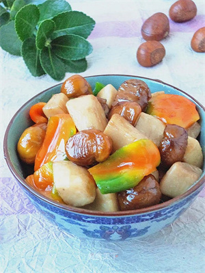 -做 法-1. 香菇焯开水,2分钟,去掉把儿,切成三角块。茭白切滚刀块;2. 把茭白七成油温炸制牙黄色。再把香菇跟栗子过一下油;3. 捞出备用;4. 炒锅留底油,爆香姜,加入生抽,老抽,各1勺。清水3勺,盐、蔬果粉适量;5. 把炸好的食材放进去,翻炒均匀即可。