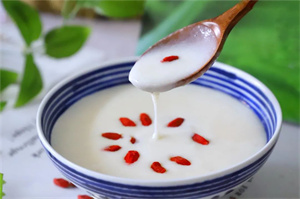 6. 打好的山药百合奶羹倒入碗中,放上几粒枸杞就可以了。