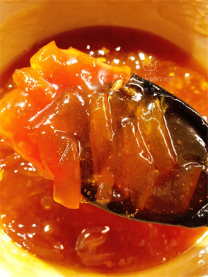 ① 金桔去掉头上的蒂,盐水浸泡十分钟后洗净。每一个十字刀一共切成4块,放入锅中;② 陈皮洗净切碎;③ 所有材料放入锅中,包括水和盐;④ 开大火煮,材料搅拌均匀,煮滚后保持大火状态;⑤ 一开始不用频繁搅拌,几分钟搅一下即可;⑥ 煮至40分钟时金桔膏会变得很浓稠;⑦ 趁热装入事先消毒干燥的容器中,拧紧倒置至冷却;⑧ 花点时间熬点金桔膏给家人是极好嗒!经常喉咙不舒服容易咳嗽的也可以试试呢~