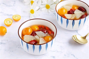 ① 豆雪梨去皮切小块,金桔用盐搓洗,用刀把每个金桔划2~3个口子;② 往康佳养生壶内加入雪梨、金桔、红枣和冰糖;③ 倒800毫升的清水,选择“花果茶”程序;④ 最后剩余2分钟时,加入枸杞;⑤ 润肺止咳饮,清甜爽口又开胃。