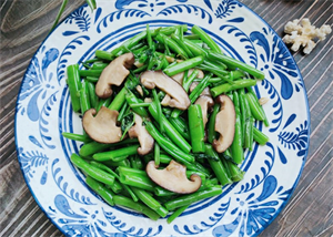 -做 法-1. 食材清洗,空心菜去掉叶子部分。2. 香菇切好,空心菜梗切段。3. 锅内放油,放花椒、姜末炒香。4. 放入香菇翻炒5. 倒入空心菜梗,翻炒一会。6. 放盐、蔬果粉大火快炒1分钟关火,装盘。