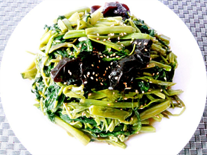 -材 料-空心菜500g、木耳适量、素蠔油2勺、姜末适量、盐、芝麻、花椒油适量