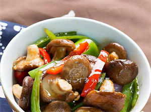 做 法:1、将新鲜香菇洗净,切去老根;青、红椒切丝2、起油锅,爆香姜末,放入香菇略炒,再放入青、红椒丝3、大火翻炒至7成熟时加入盐、蔬果粉、素蠔油,炒匀后即可出锅