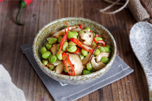做 法:1、香菇去蒂切成薄片,红椒切成细丝,生姜切末2、起锅加入菜籽油,加入姜末炒出香味3、加入香菇翻炒至见软出水4、加入毛豆仁,翻炒片刻5、加入红椒,素蠔油将所有食材炒熟6、最后加少许盐调味,炒匀出锅即可