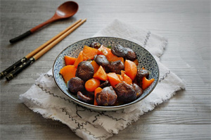 材 料:胡萝卜1根,干香菇15朵,酱油1汤匙,盐适量
